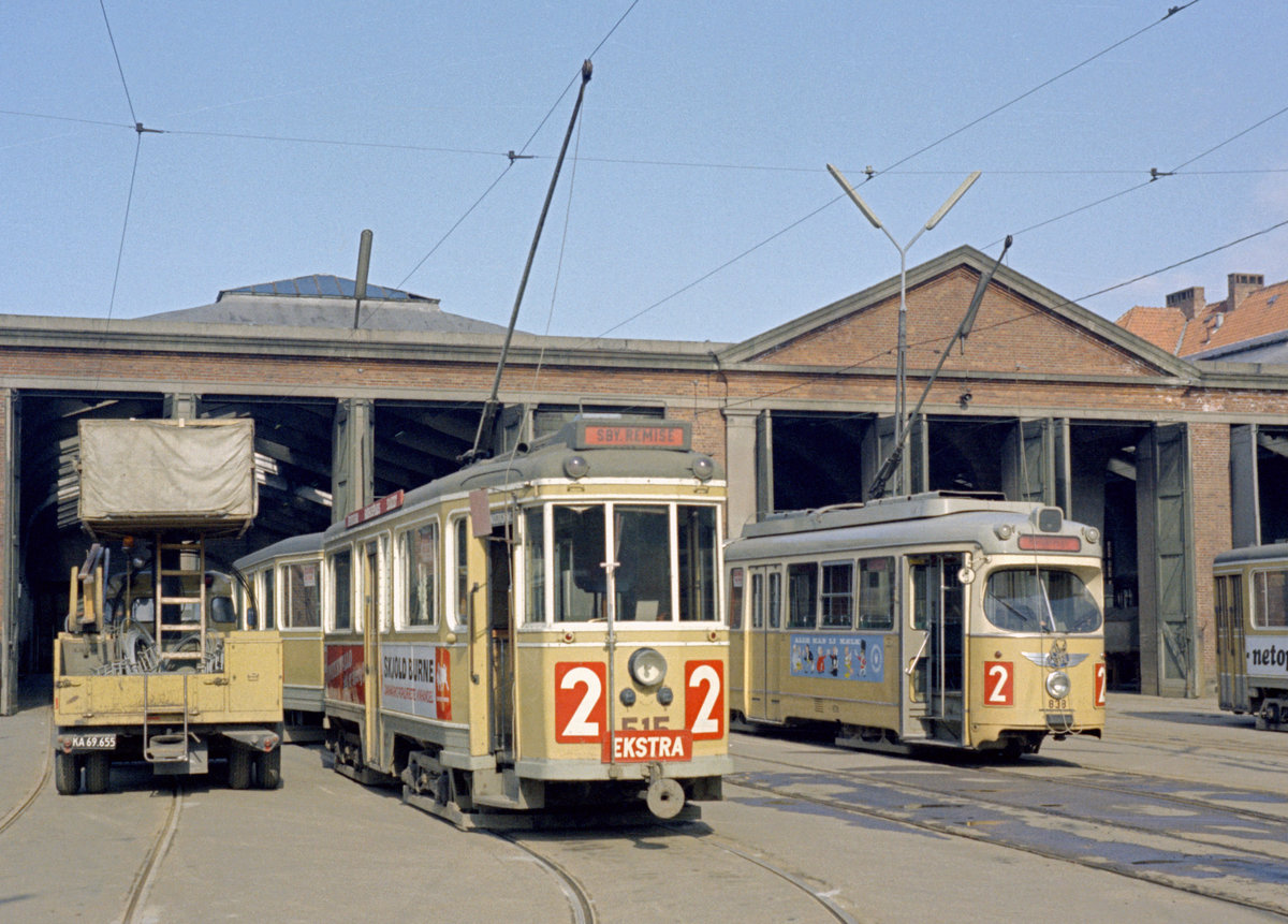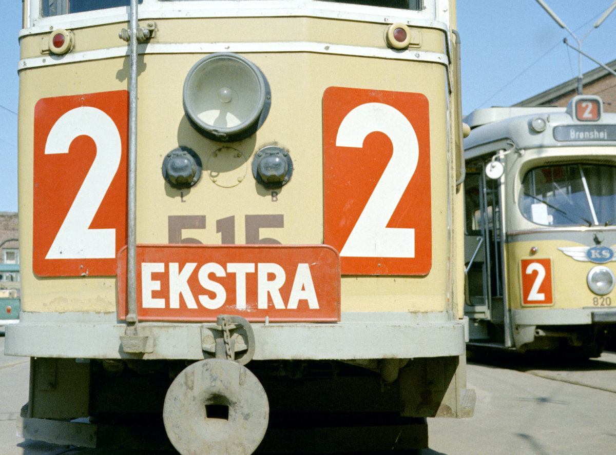 København / Kopenhagen Københavns Sporveje (KS) SL 2: Auf der Nahaufnahme des Drehgestelltriebwagens 515 sind die Spuren des Alters kaum zu verbergen. Der Tw gehörte zur KS-Serie 501 - 618, die zwischen 1930 und 1941 von der Hauptwerkstätte der KS hergestellt wurde. Die letzten Tw dieses Typs fuhren bis zur endgültigen Einstellung des Kopenhagener Straßenbahnbetriebs im April 1972. - In den Sommermonaten des Jahres 1969 gab es nur ganz wenige Drehgestellwagen in Betrieb, u.a. der Tw 515, der als Einsatzzug auf der SL 2 fuhr. - Datum: 23. Mai 1969. Aufnahmeort: Sundby Remise / Straßenbahnbetriebsbahnhof Sundby. - Scan eines Farbnegativs. Film: Kodak Kodacolor X.