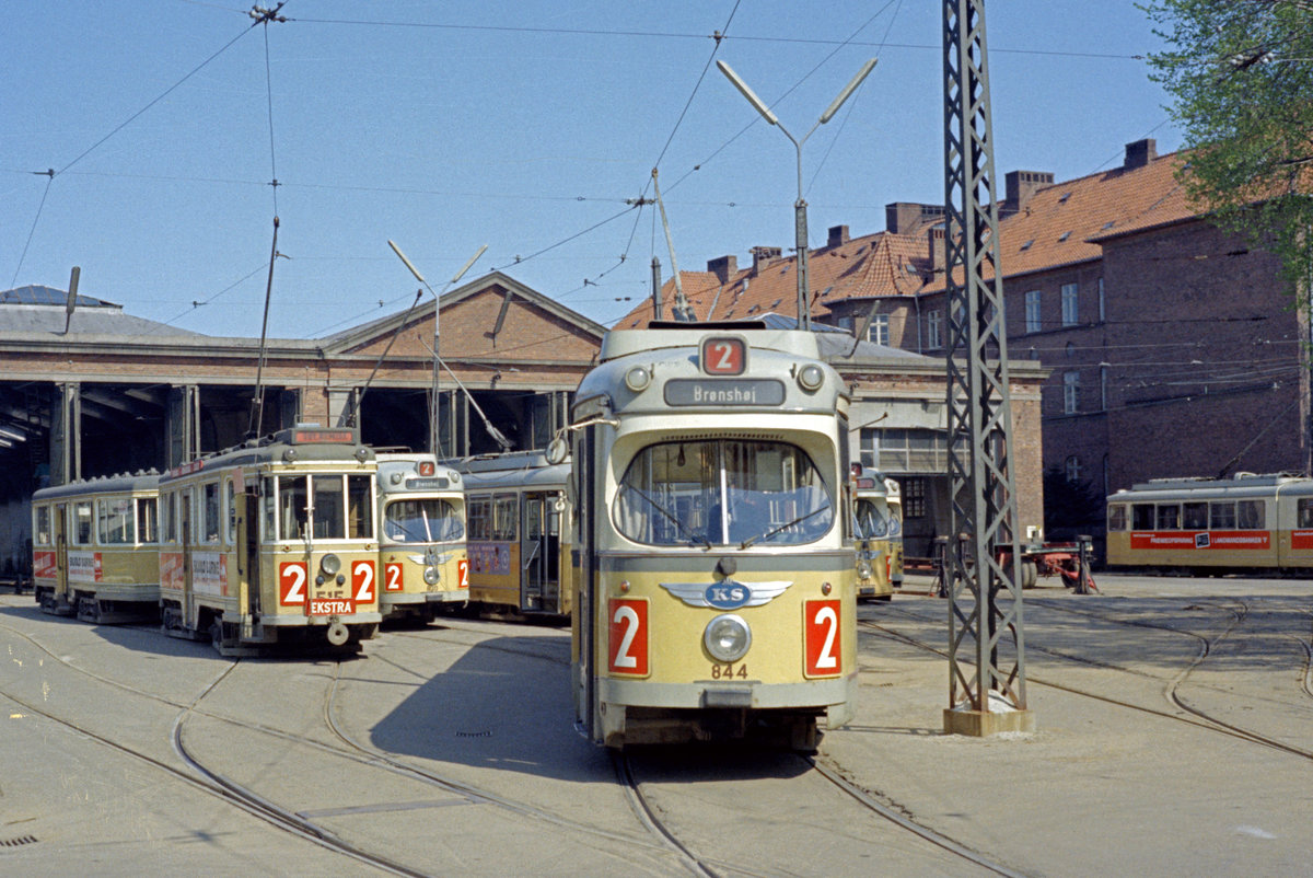 København / Kopenhagen Københavns Sporveje: Vor den Wagenhallen des Straßebahnbetriebsbahnhofs Sundby stehen am 23. Mai 1969 einige Straßenbahnen einsatzbereit, u.a. der DÜWAG/Kiepe-GT6 844 als SL 2. - Scan eines Farbnegativs. Film: Kodak Kodacolor X.