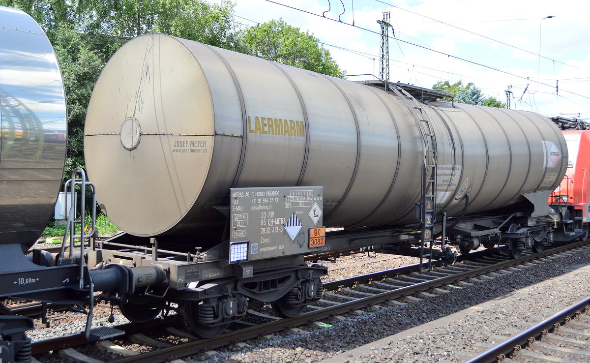 Kesselwagen aus der Schweiz der MITRAG AG mit der Nr. 33 RIV 85 CH-MITRA 7832 413-3 Zaens HEIMATBAHNHOF: BERN (UN-Nr.: 90/3082 = umweltgefährdender Stoff, flüssig, N.A.G. siehe Aufschrift Schweröl) Aufschrift am Kessel "LAERMARM" am 30.06.18 Bf. Hamburg-Harburg.