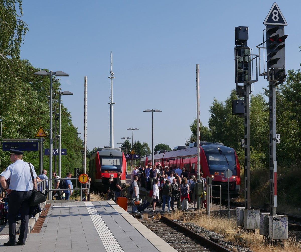 Manchem Bedenkenträger stehen vielleicht die Haare zu Berge, dabei ist das die übliche Situation in Büchen: Egal ob die Fahrgäste aus- oder zusteigen wollen oder umsteigen aus / in Richtung Hamburg oder Berlin - Dresden - Prag oder Schwerin - Rostock, alle müssen durch diesen Engpass übers Gleis während links RE 83 nach Lüneburg und rechts der Gegenzug nach Lübeck - Kiel stehen. Bei hohem Fahrgastaufkommen bzw. knappen Übergangszeiten ist dies besonders spannend. Soviel auch zum Thema Aufenthalt im Gleisbereich; 13.07.2018