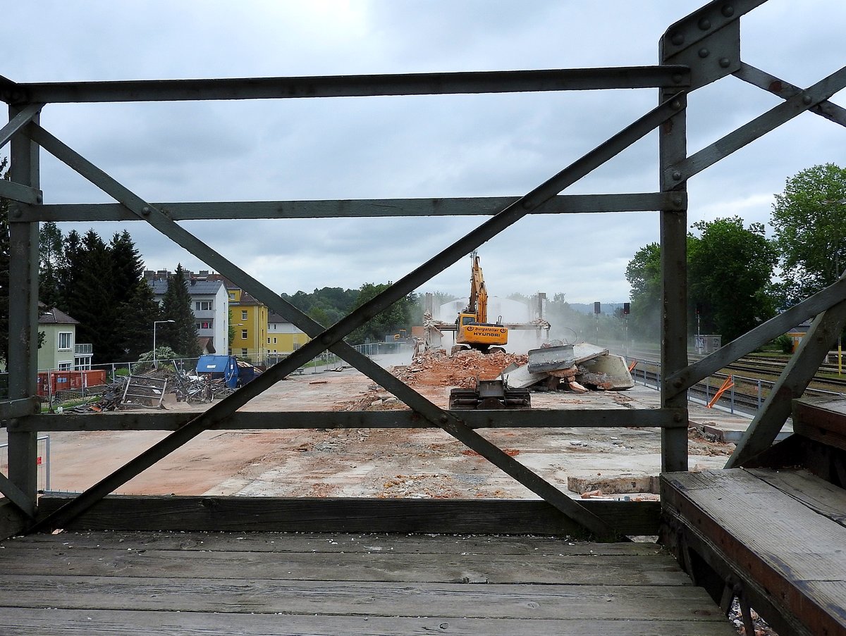 Sicherheitsabstand einhalten! während der Bagger (HYUNDAI 210-C7) das alte Gütermagazin am Bahnhof Ried i.I. niederreißt; 180601