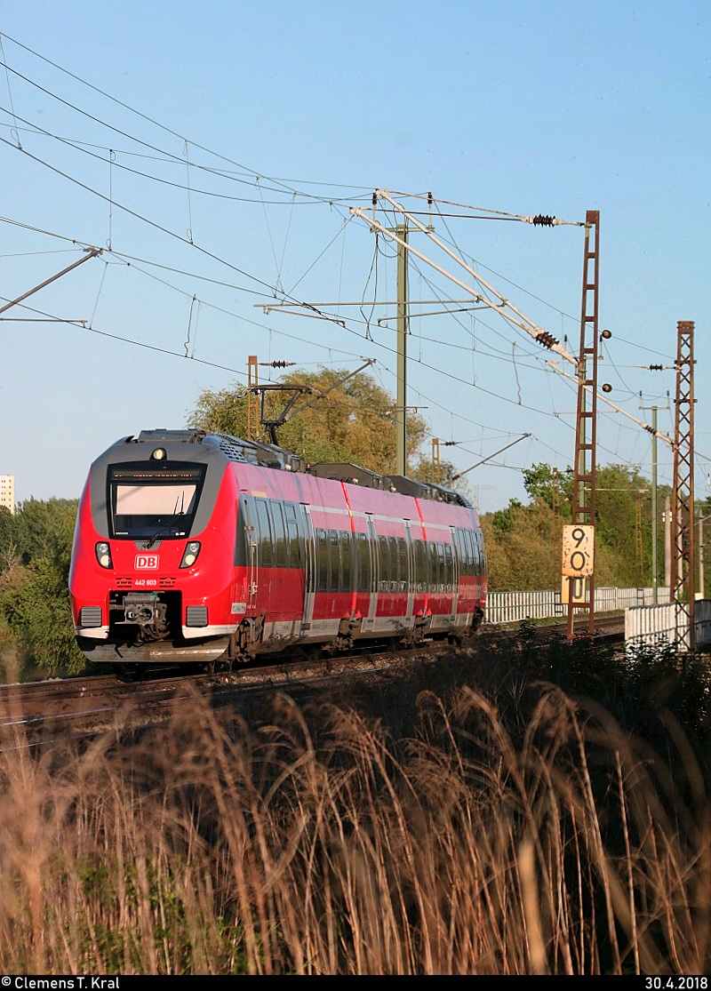 Über den Sträuchern: Nachschuss auf 442 603 (Bombardier Talent 2) der S-Bahn Mitteldeutschland (DB Regio Südost) als S 37759 (S7) von Halle-Nietleben nach Halle(Saale)Hbf Gl. 13a, die in der Saaleaue bei Angersdorf auf der Bahnstrecke Halle–Hann. Münden (KBS 590) fährt. [30.4.2018 | 18:59 Uhr]