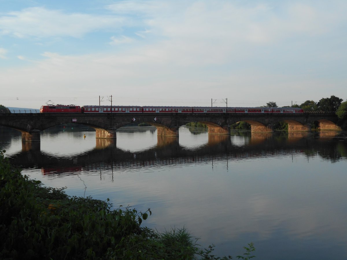 Um 6.58 Uhr am 04.07.2018 schiebt eine unbekannte 111 (111 026 oder 111 042) des Bw Ludwigshafen die Regionalbahn RB 38609 mit fünf n-Wagen von Bensheim nach Mannheim über die Neckarbrücke bei Ladenburg.