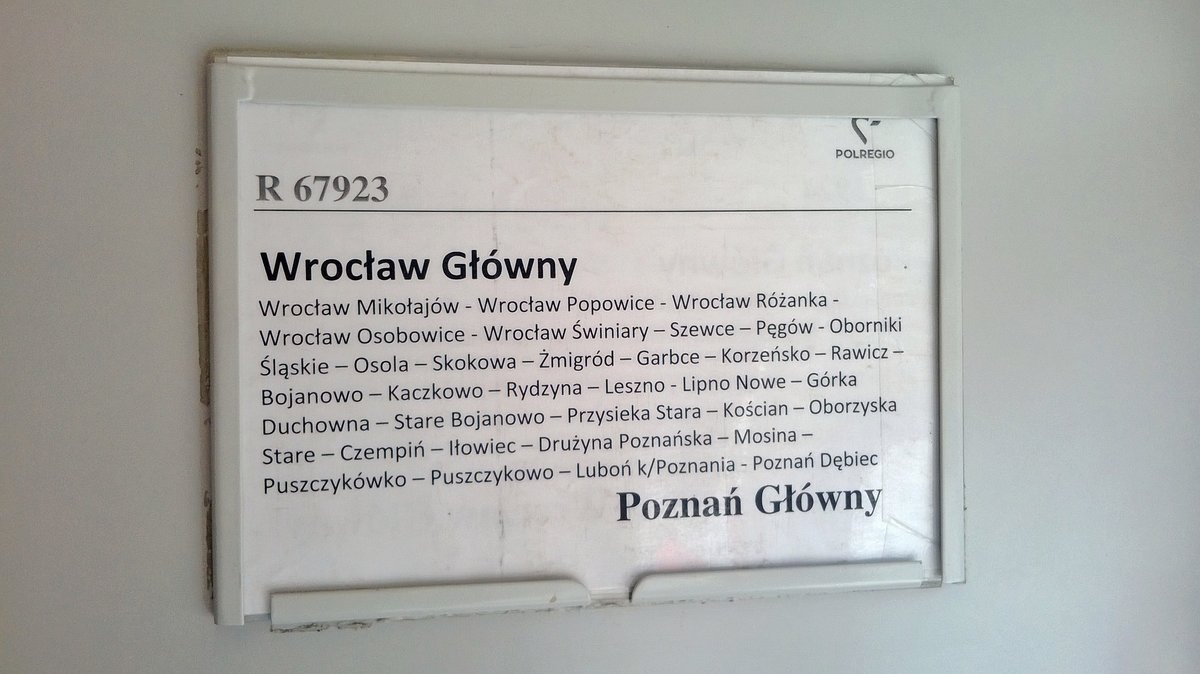 Zuglaufschild der R 67923 von Wroclaw nach Poznan, 26.05.2018