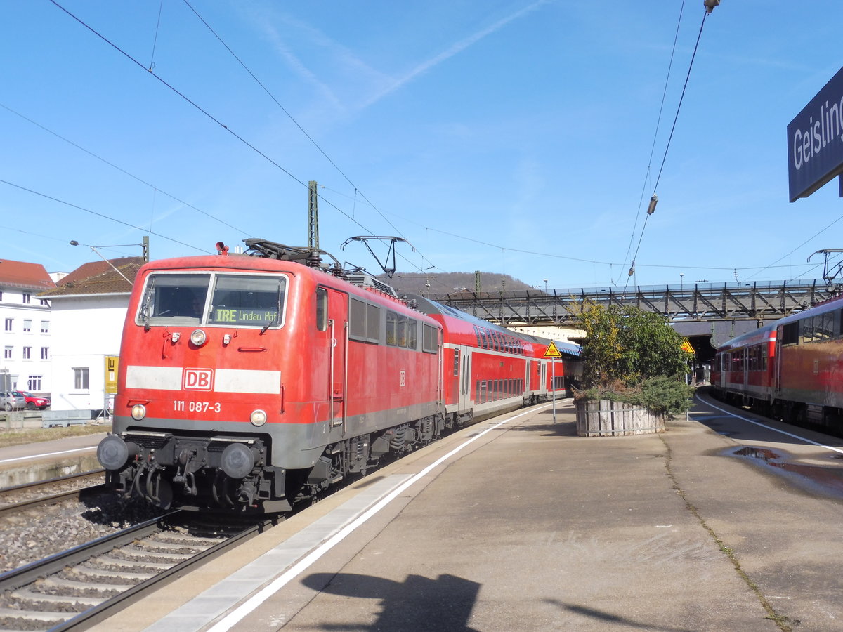 111 087 mit Doppelstockwagen als IRE nach Lindau Hbf im März 2018 in Geislingen(Steige)