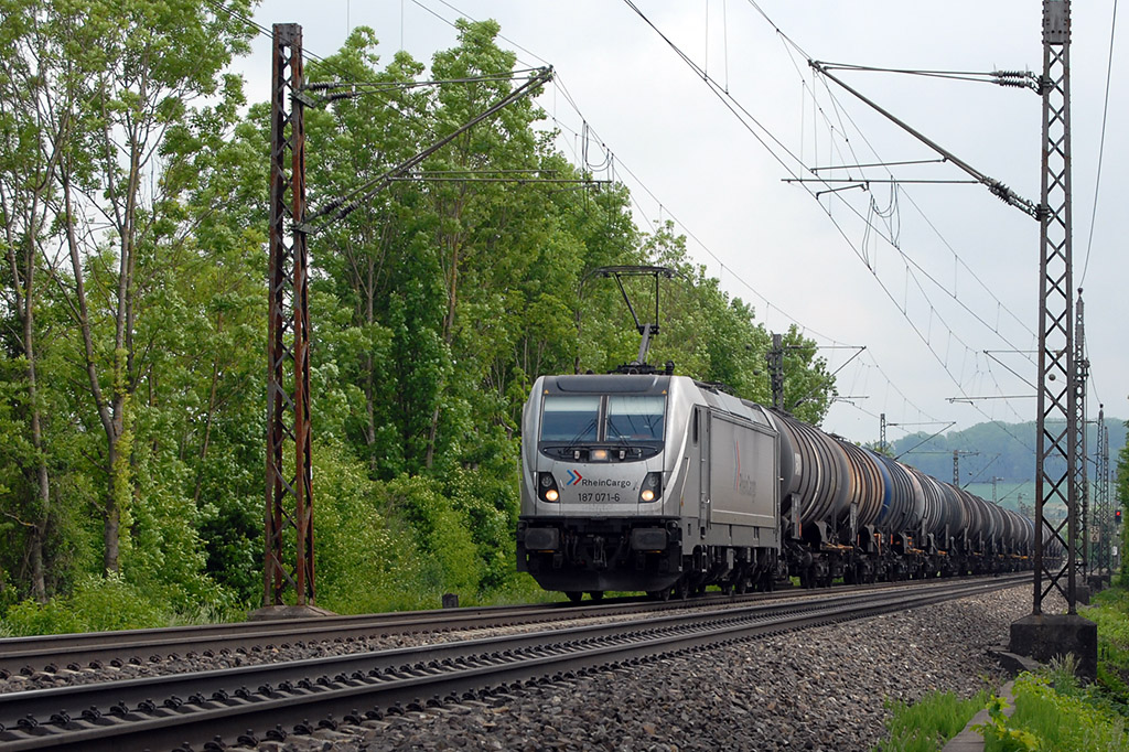 Mit einem leeren Kesselzug aus der Schweiz, fuhr am 03.04.2017 die Maquarie/RHC 2056 (185 588-1) zusammen mit der Wagenlok 187 079-9 durch die Gleisanlagen von Müllheim (Baden) gen Norden.