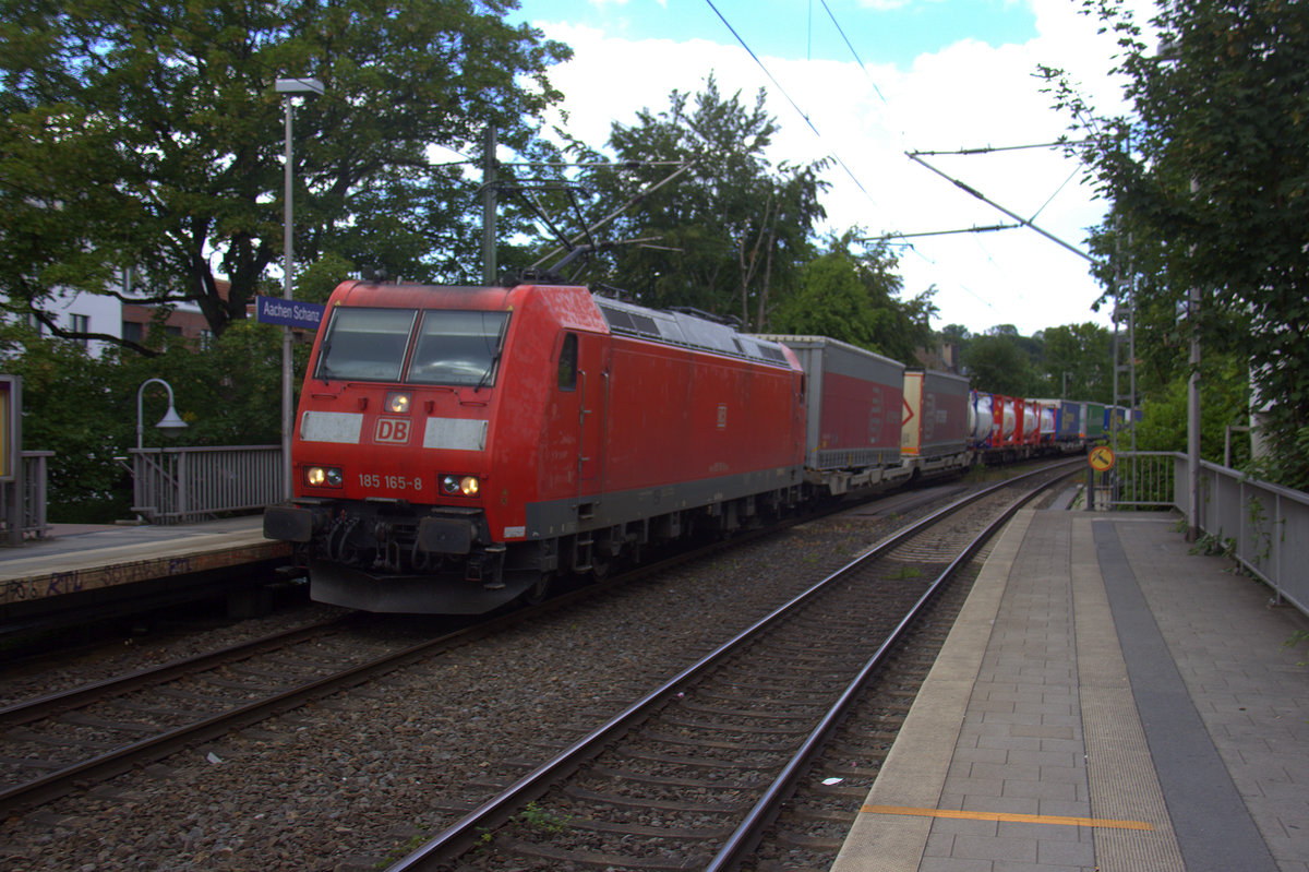 185 165-8 DB kommt aus Richtung Aachen-West mit einem LKW-Zug aus Zeebrugge-Vorming(B) nach Novara-Boschetto(I) und fährt durch Aachen-Schanz in Richtung Aachen-Hbf,Aachen-Rothe-Erde,Stolberg-Hbf(Rheinland)Eschweiler-Hbf,Langerwehe,Düren,Merzenich,Buir,Horrem,Kerpen-Köln-Ehrenfeld,Köln-West,Köln-Süd.