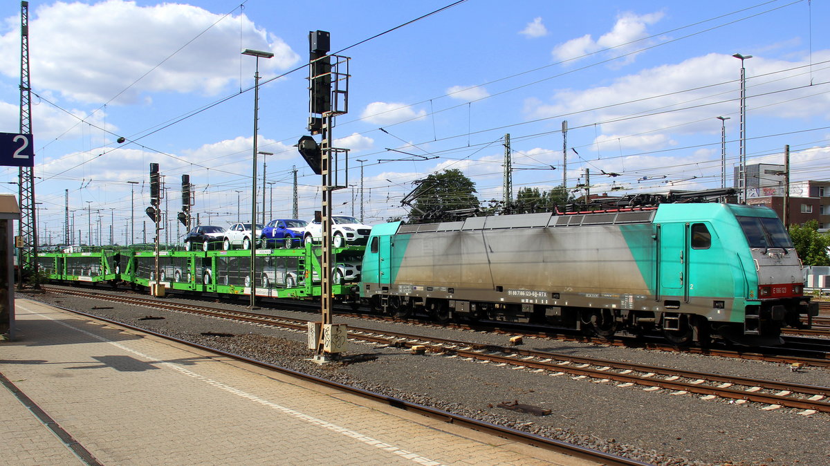 186 123 von Railtraxx steht in Aachen-West mit einem Jaguar-Autozug aus Graz-Vbf(A) nach Zeebrugge(B).