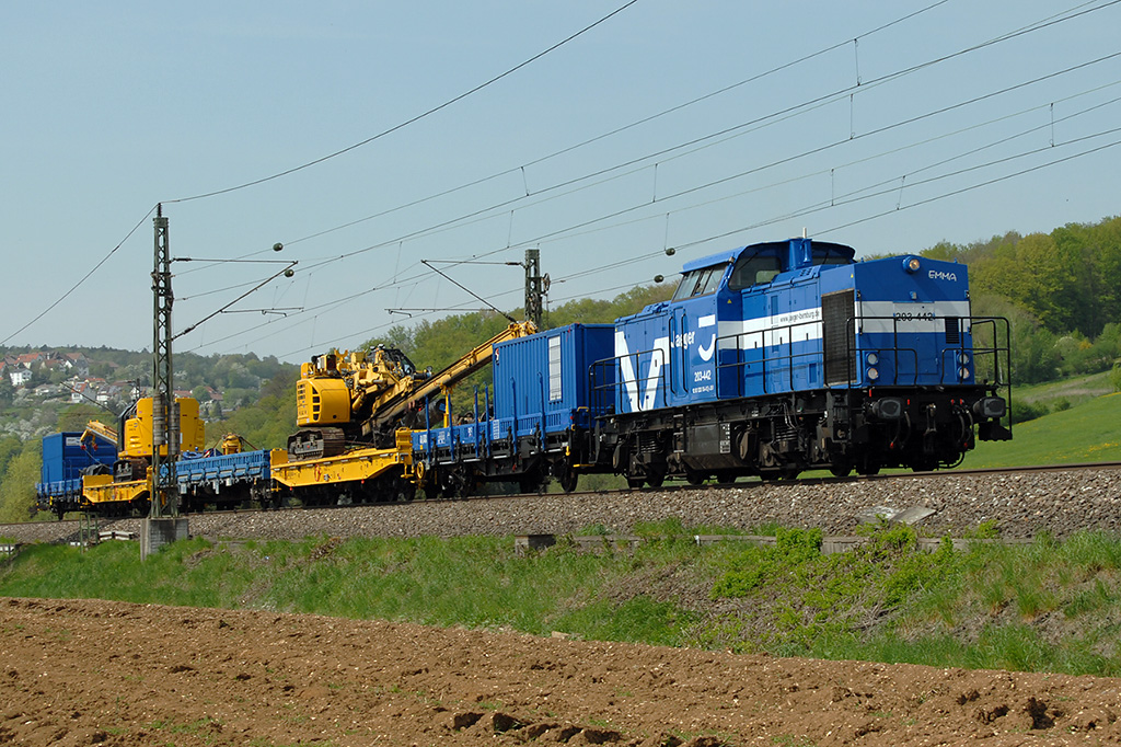 während auf dem Nebengleis ein KLV mit Anhänger der DB-Netzinstandhaltung wartet...