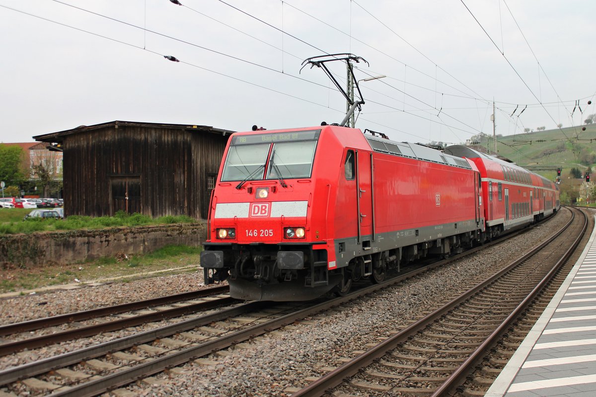 Ausfahrt am 04.04.2017 von der Freiburger 146 205 mit ihrer RB (Offenburg - Basel Bad Bf) aus dem Bahnhof von Efringen Kirchen, als sie nur noch wenige Kilometer bis zum Zielbahnhof hatte.