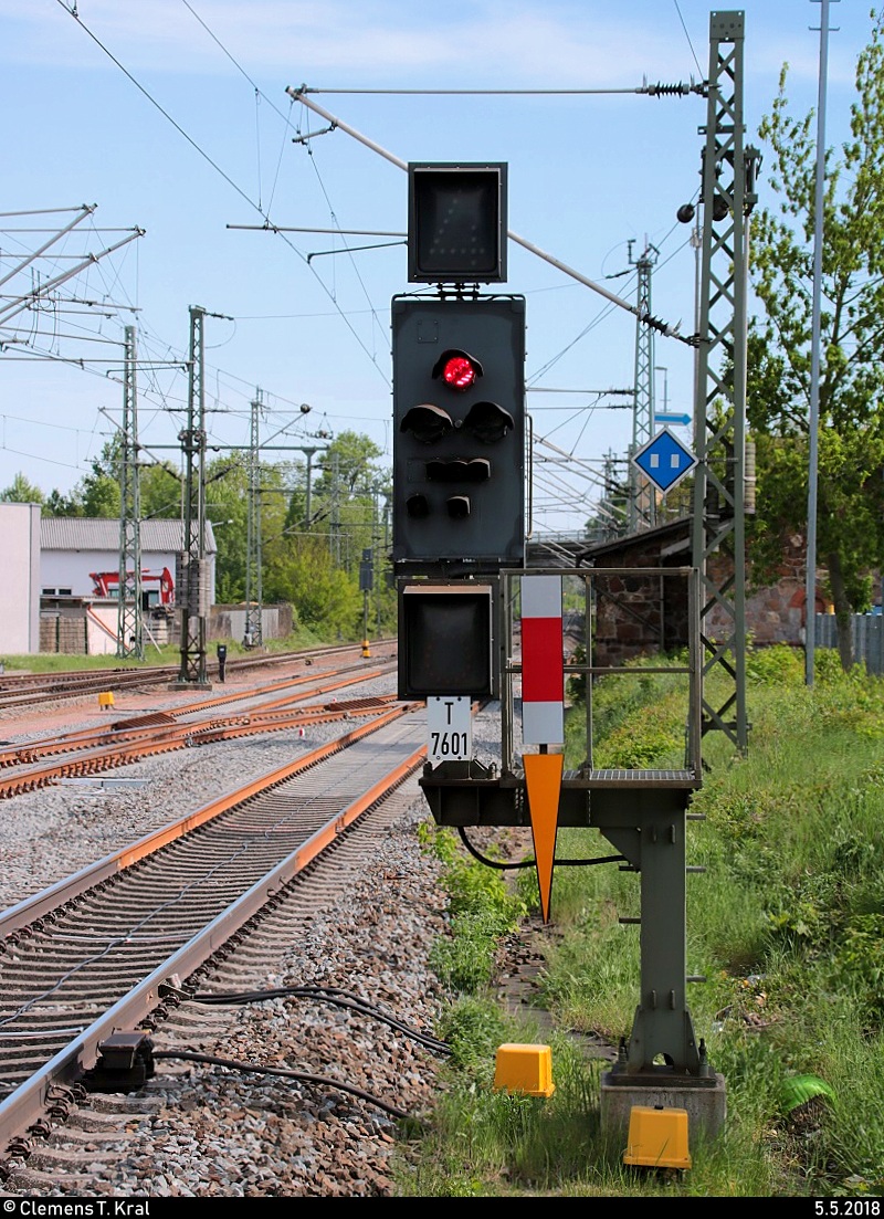 Blick auf ein Ausfahrsignal (Asig) in Form eines Ks-Signals im Bahnhof Delitzsch unt Bf auf der Bahnstrecke Trebnitz–Leipzig (KBS 251) Richtung Leipzig, das auf einem vergleichsweise kleinen Mast und recht nah am Gleis steht. [5.5.2018 | 16:04 Uhr]