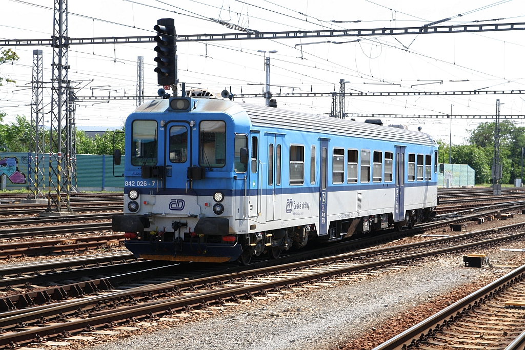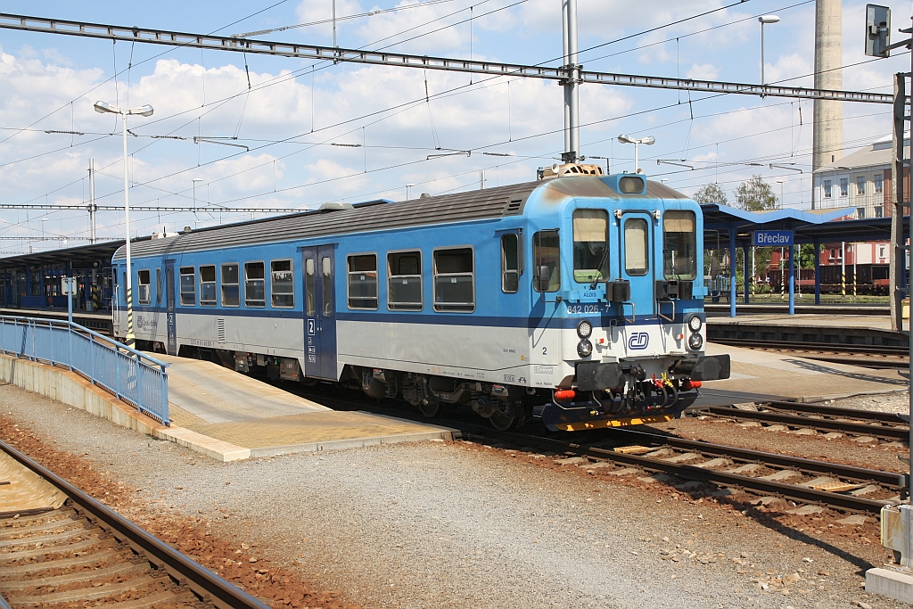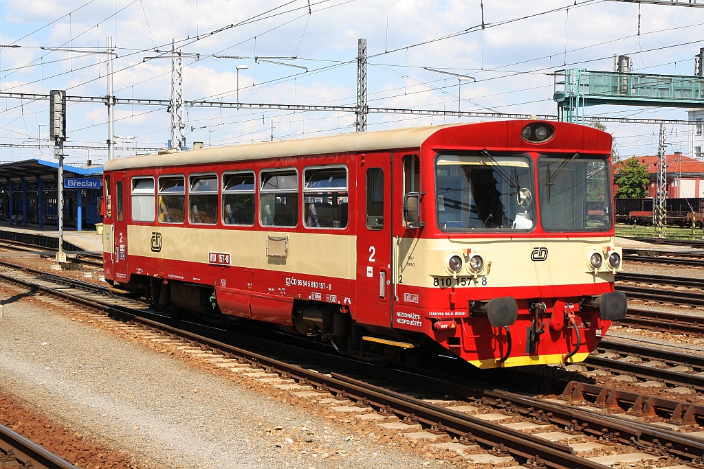 Abfahrbereiter Os 24525 (Lednice - Breclav) mit CD 810 157-8 und CD 55 54 93-29 134-9 BDtax am 07.Juli 2018 im Bahnhof Lednice.