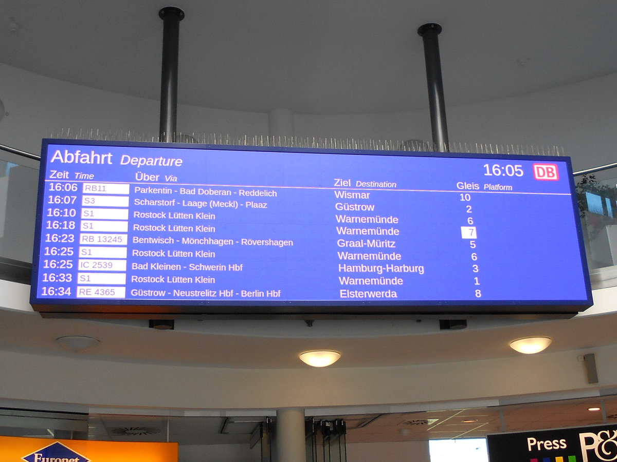 Im Rostocker Hbf,in der Südhalle,hängt dieser Zugzielanzeiger.Aufnahme vom 15.Juli 2018.