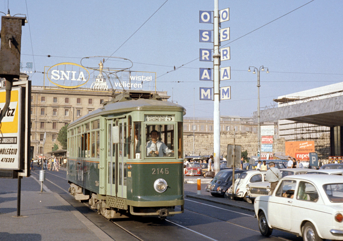 Roma / Rom ATAC Linea tranviaria / SL 5 (MRS 2145) Piazza dei Cinquecento / Stazione Termini am 23. August 1970. - Im Hintergrund rechts sieht man (undeutlich) einen Teil der sogenannten "Servianischen Stadtmauer" aus dem 4. Jahrhundert v. Chr. Laut antiken Schriftquellen ließ der sechste römische König, Servius Tullius, Mitte des 6. Jahrhunderts eine Mauer erbauen, die Reste der alten Mauer datieren die Archäologen jedoch in die Mitte des 4. vorchristlichen Jahrhunderts. - Scan eines Farbnegativs. Film: Kodak Kodacolor X.