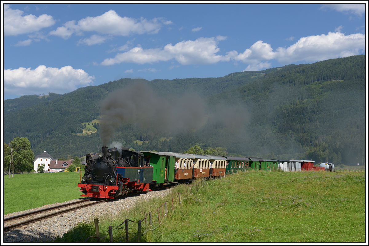 SKGLB 22 bespannte am 19.7.2018 einen Sonderzug von Mauterndorf in der Ferienregion Lungau, nach Murau und wieder retour. Die Aufnahme zeigt den Zug bei der Retourfahrt in St. Lorenzen.