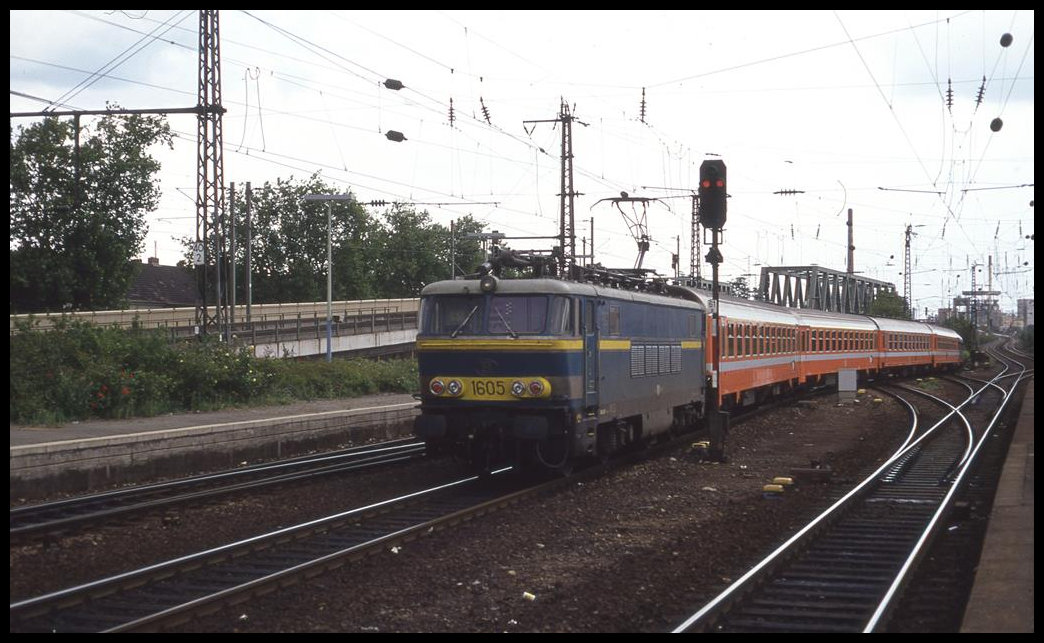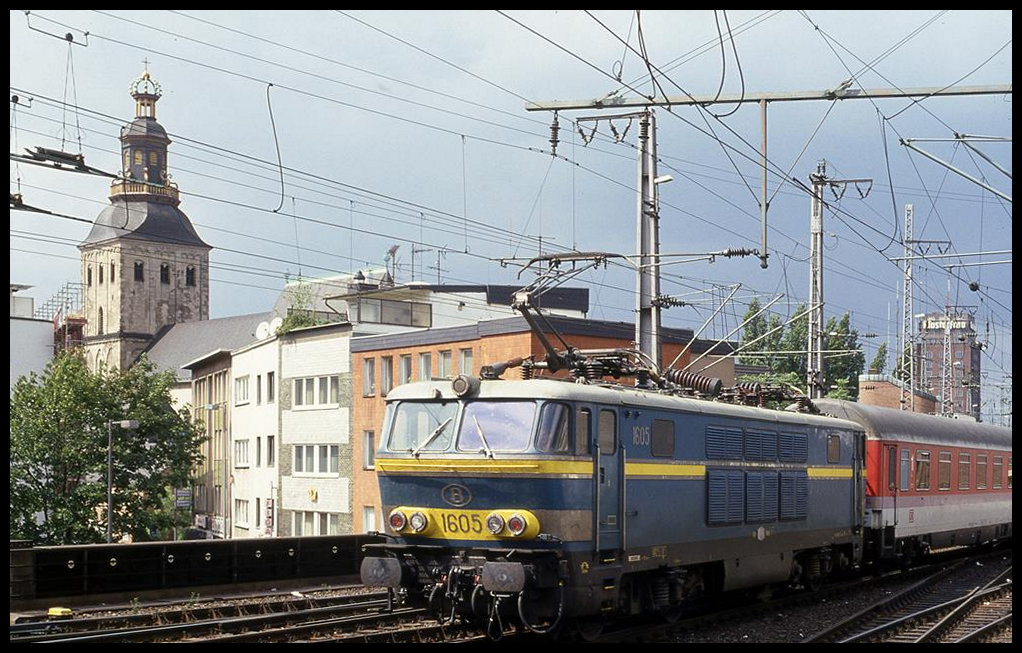 SNCB 1605 fährt hier am 13.08.1994 um 15.41 Uhr mit dem EC 47 aus Brüssel in Köln HBF ein.