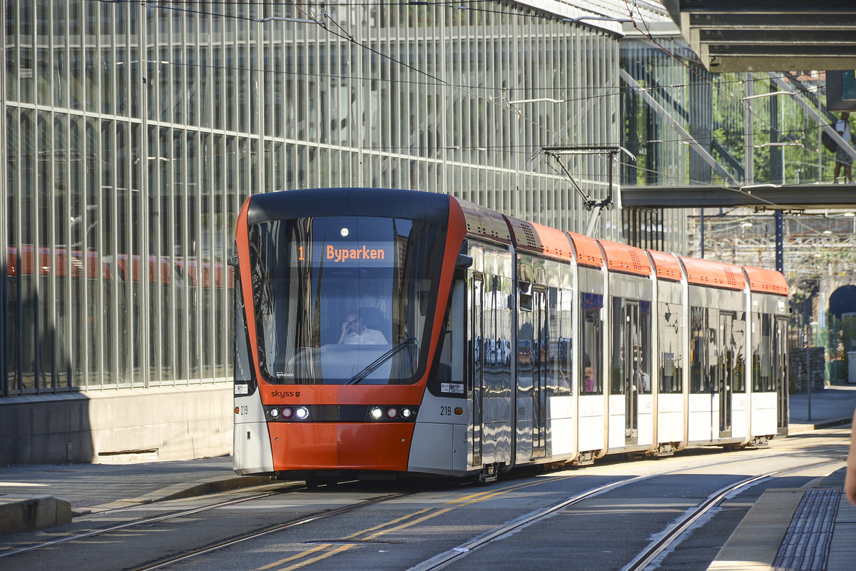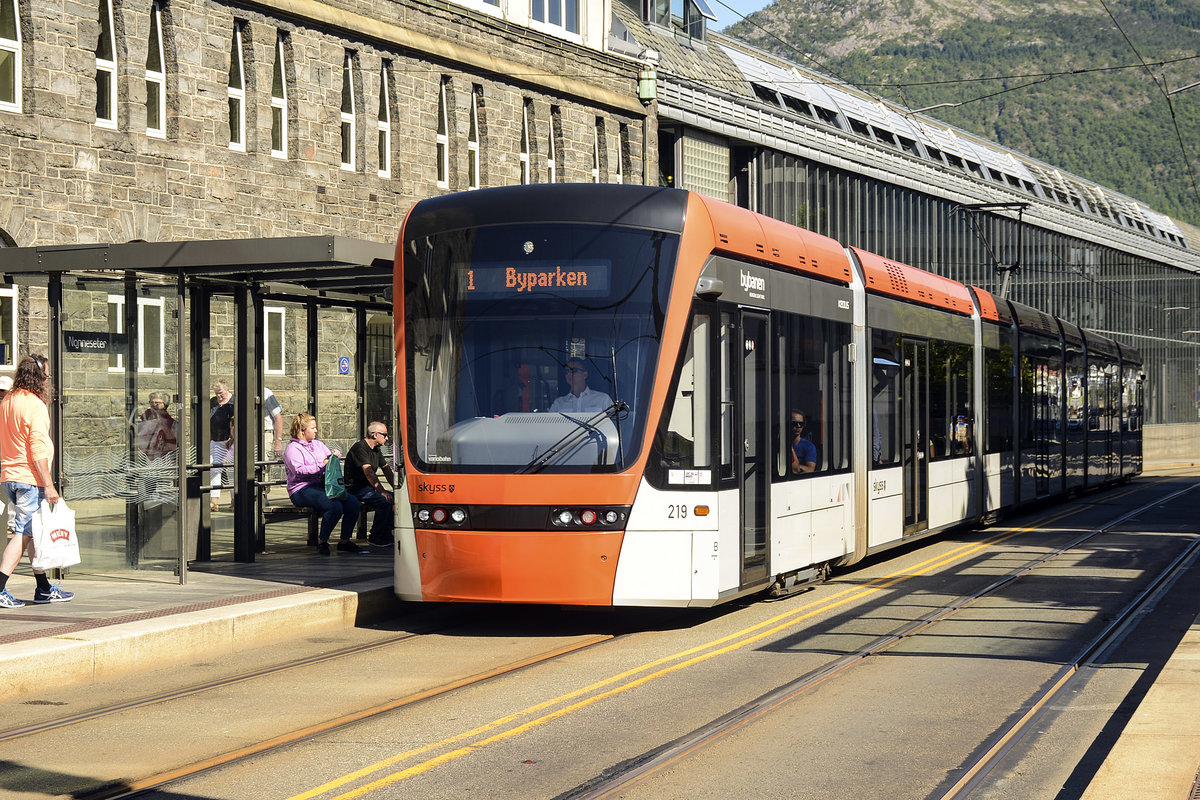 Stadtbahnwagen 219 am Bergen Hauptbahnhof. Nach Baubeginn am 7. Januar 2008 verkehrt die Stadtbahn seit ihrer Eröffnung am 22. Juni 2010 auf einer 9,8 km langen ersten Teilstrecke von der Innenstadt nach Nesttun im Stadtbezirk Fana.
