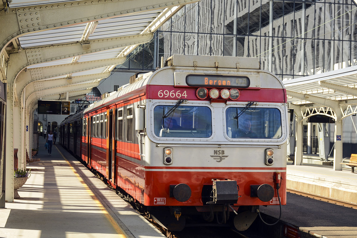 Triebzug 69664 (Type 69) des NSB (Norske Statsbaner) auf Gleis 2 im Bahnhof von Bergen. Aufnahme: 10. Juli 2018.