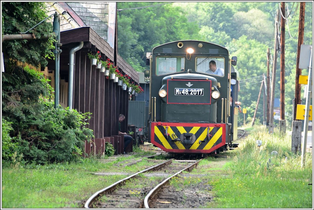 Waldbahn Királyrét (Királyréti Erdei Vasút, Királyréti Kisvasút). Mk 48.2017 hat während der Depotbesichtigung bereits die Endstation erreicht und befindet sich schon wieder auf der Rückfahrt. Kreuzung in Paphegy. (12.06.2018)