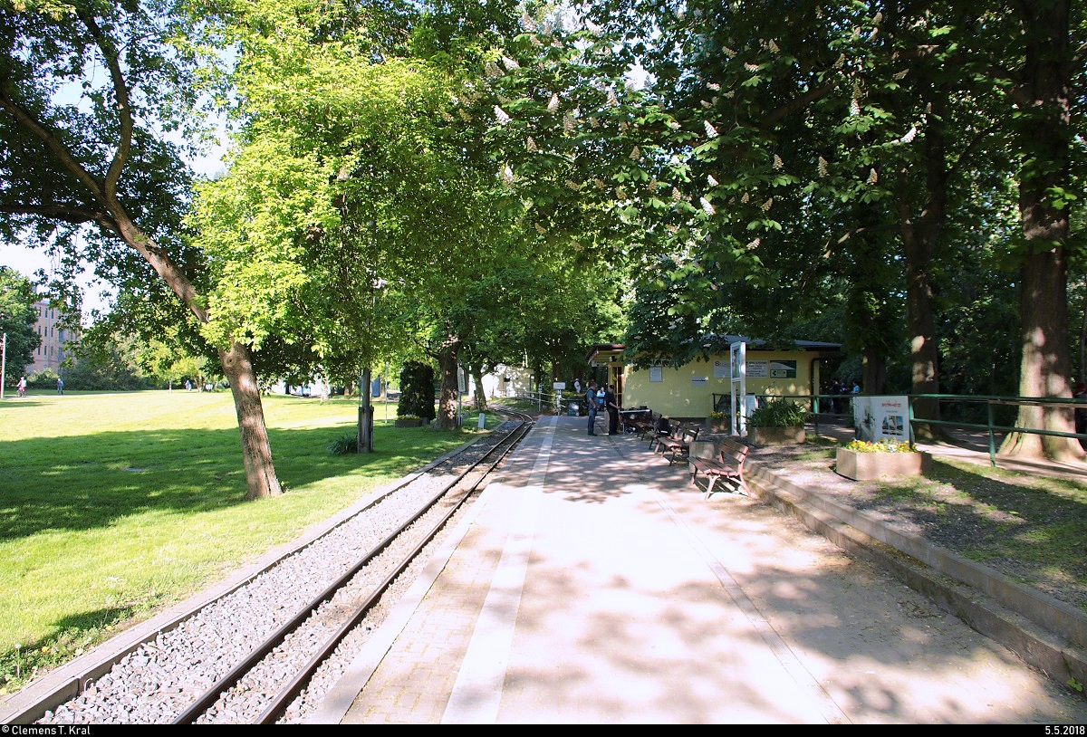 10. Museumsnacht Halle (Saale) und Leipzig: Besuch von 4 Eisenbahnmuseen am 5. Mai 2018 von 18:00 bis 0:00 Uhr. Enttäuschung: Bei der Ankunft am Gelände der Parkeisenbahn Auensee Leipzig stellte sich heraus, dass erst ab 19:00 Uhr Fahrten angeboten werden und nicht wie offiziell geschrieben ab 18:00 Uhr. Der Zeitplan für diesen Abend sah aber einen längeren Aufenthalt nicht vor und so reichte es nur für ein paar Bilder der Bahnanlagen. Hier ist der schattig gelegene Bahnhof Auensee zu sehen, auf den sich noch kaum jemand verirrte. [5.5.2018 | 18:07 Uhr]