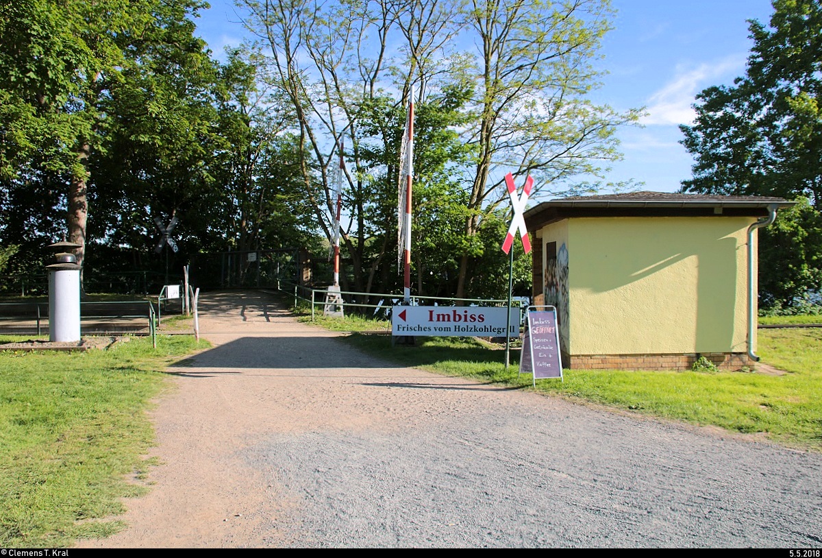 Blick auf den Zugang zum Bahnsteig des Bahnhofs Auensee der Parkeisenbahn Auensee Leipzig mit beschranktem Bahnübergang. [5.5.2018 | 18:08 Uhr]