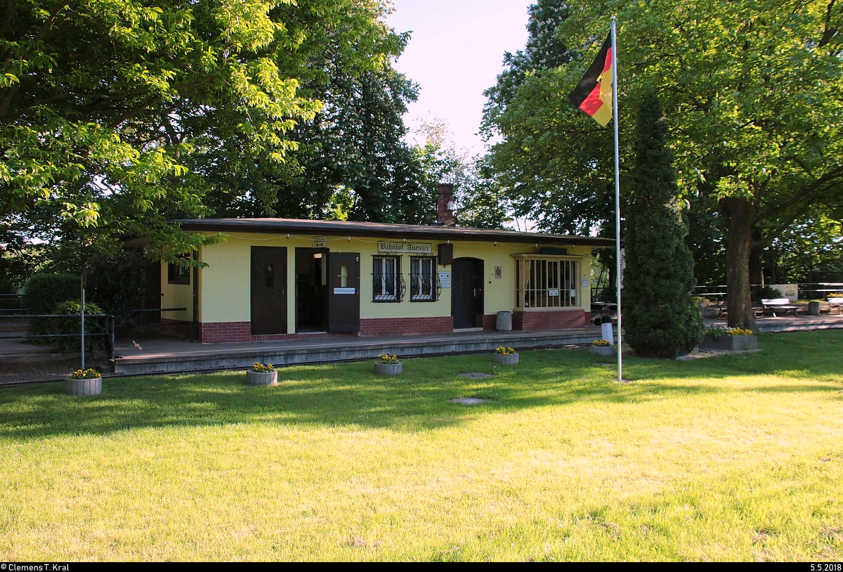 Blick auf das Empfangsgebäude des Bahnhofs Auensee der Parkeisenbahn Auensee Leipzig, in dem auch die Fahrkarten verkauft werden. [5.5.2018 | 18:16 Uhr]