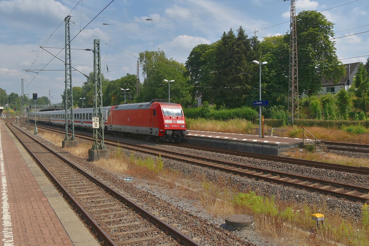101 054-5 mit einem IC am Haken bei der Durchfahrt in Gruiten, gleich macht der Zug die "Biege" in Richtung Köln. 22.7.2018