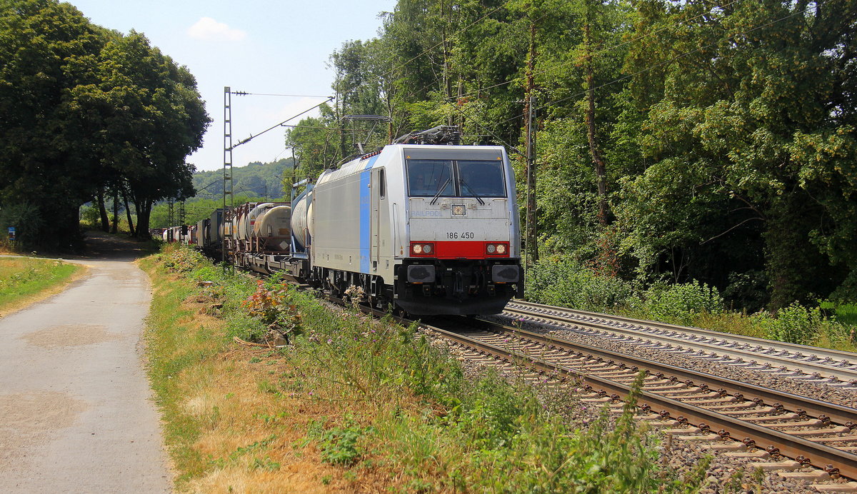 186 450-3 von Lineas/Railpool kommt aus Richtung Aachen-West und fährt die Gemmenicher-Rampe hoch mit einem LKW-Zug aus Novara- Boschetto(I) nach Zeebrugge-Vorming(B) und fährt in Richtung Montzen/Belgien. Aufgenommen an der Montzenroute am Gemmenicher-Weg. Bei Sommerwetter am Nachmittag vom 21.7.2018.