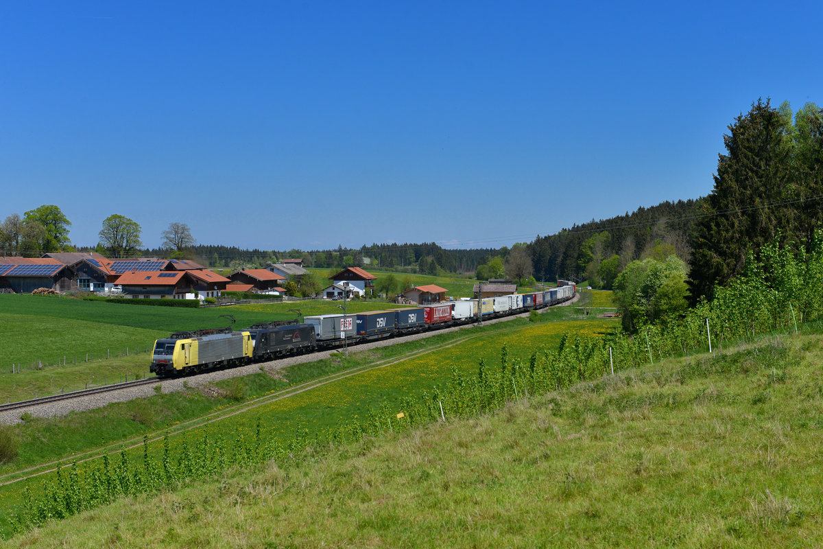 186 450-3 von Lineas/Railpool kommt die Gemmenicher-Rampe herunter nach Aachen-West mit einem langen Containerzug aus Antwerpen-Oorderen(B) nach Gallarate(I).