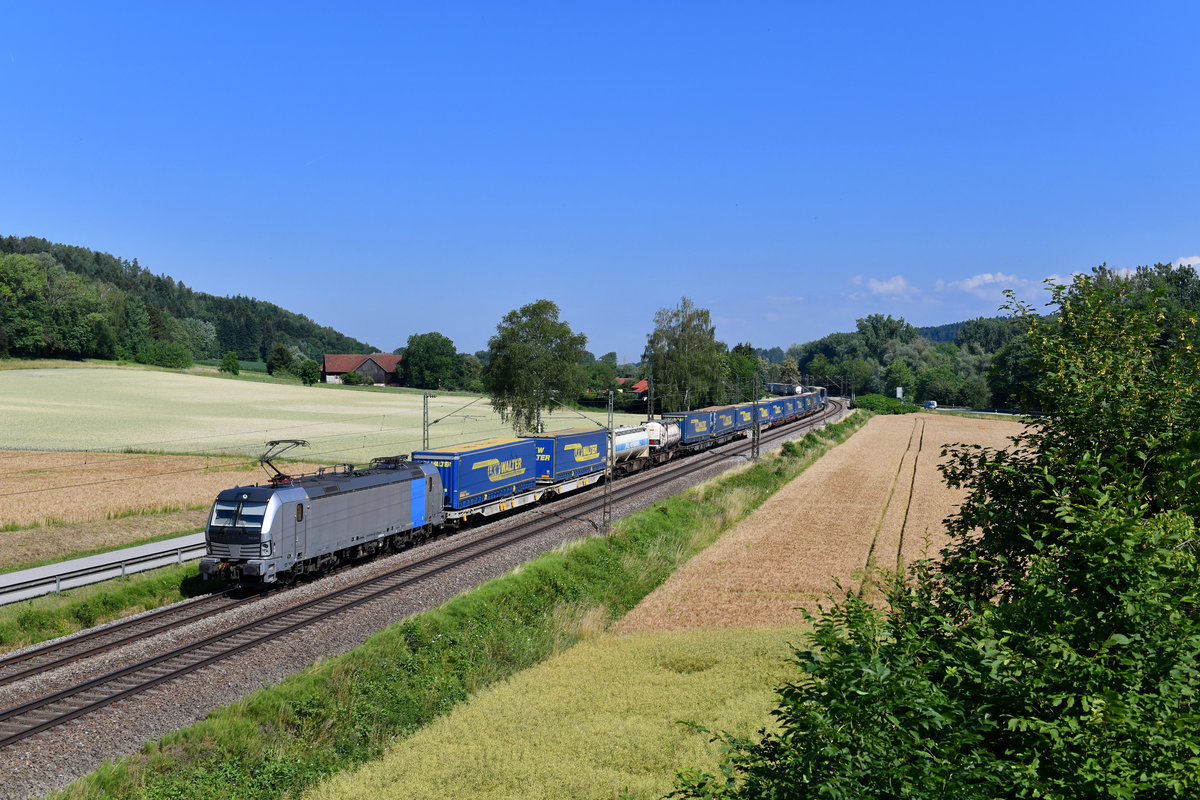 LTE Logistik- and Transport- GmbH mit ELL Vectron "193 263"[NVR-Number: 91 80 6193 263-1 D-ELOC] und KLV-Zug aus Polen Richtung Rotterdam am 18.07.18 Bf. Flughafen Berlin-Schönefeld.