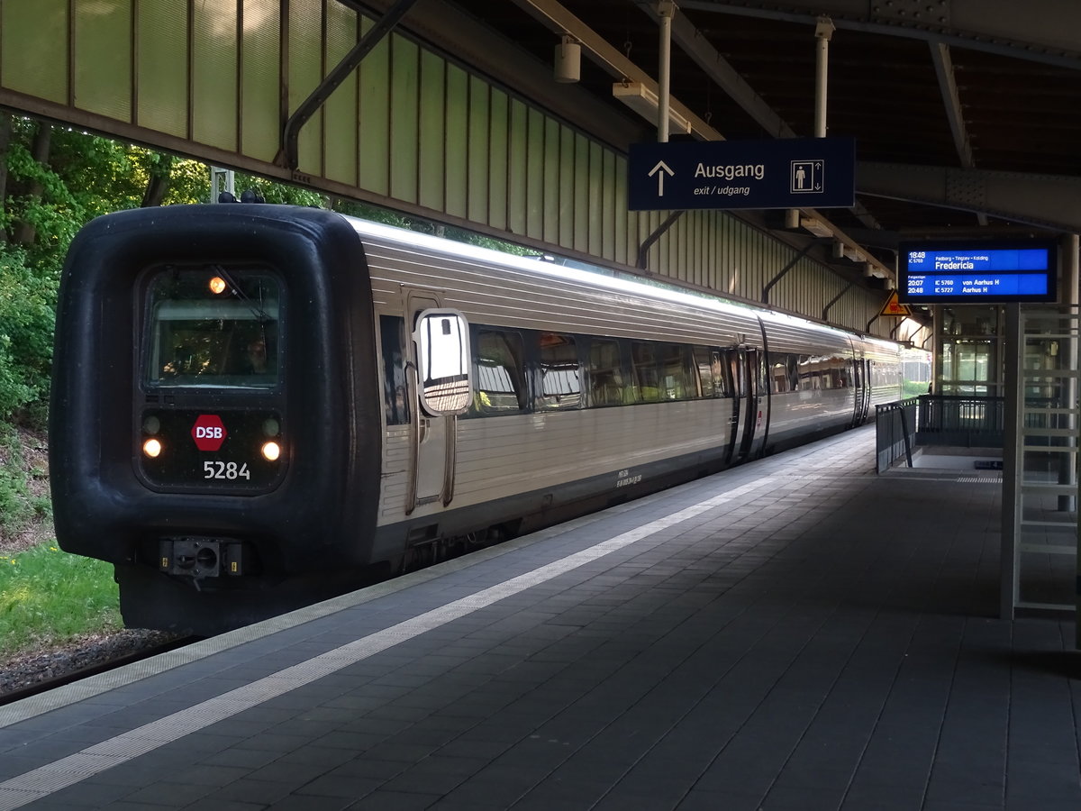 3-teiliger Dieseltriebwagen der DSB, Typ IC3, Bezeichnung MFA 5284, abfahrbereit als IC 5769 nach Fridericia. Aufgenommen in Flensburg Hbf., 14.5.2018