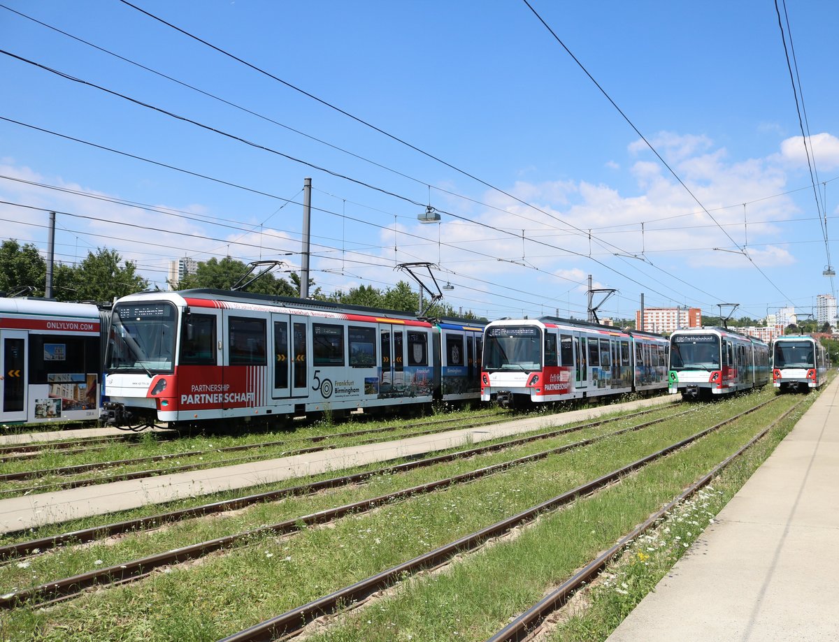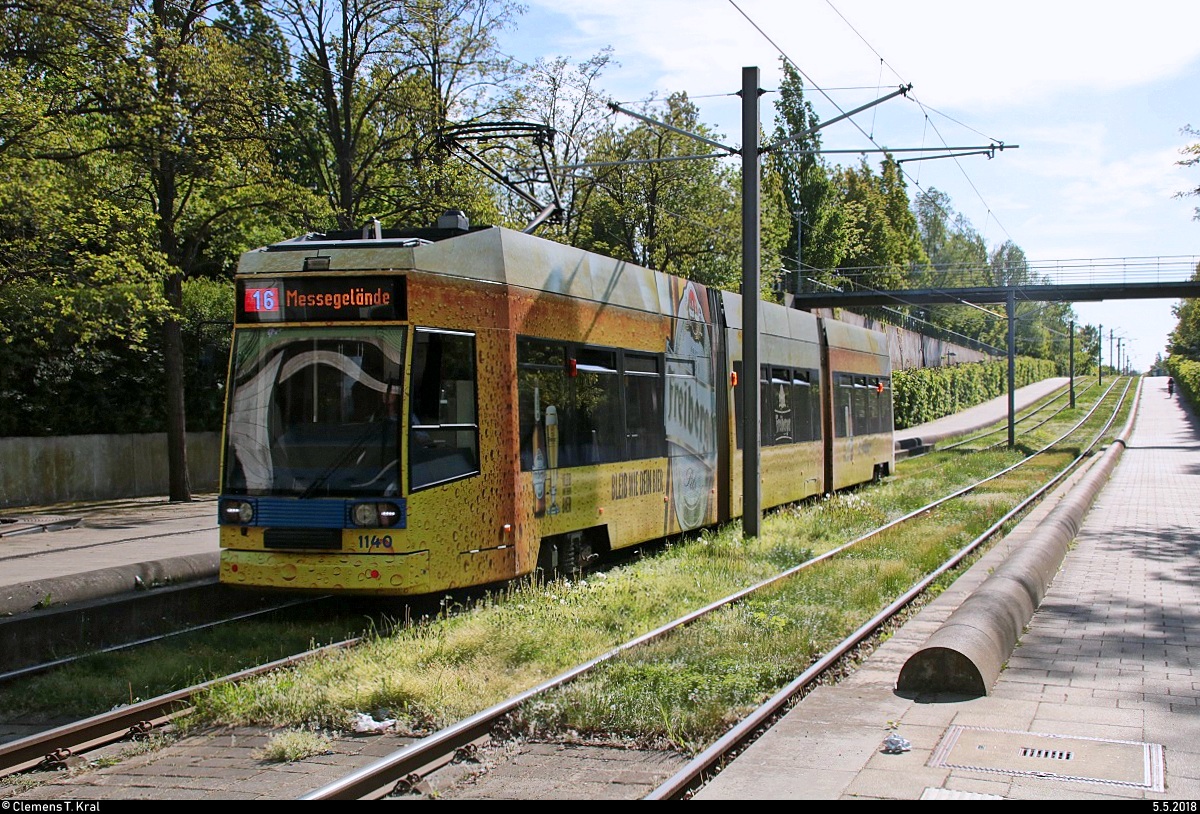 Duewag/Siemens NGT8, Wagen 1140 mit Werbung für das Freiberger Brauhaus, der Leipziger Verkehrsbetriebe (LVB) als Linie 16 von Leipzig-Lößnig nach Leipzig Messegelände erreicht die Haltestelle S-Bf. Messe. [5.5.2018 | 17:21 Uhr]