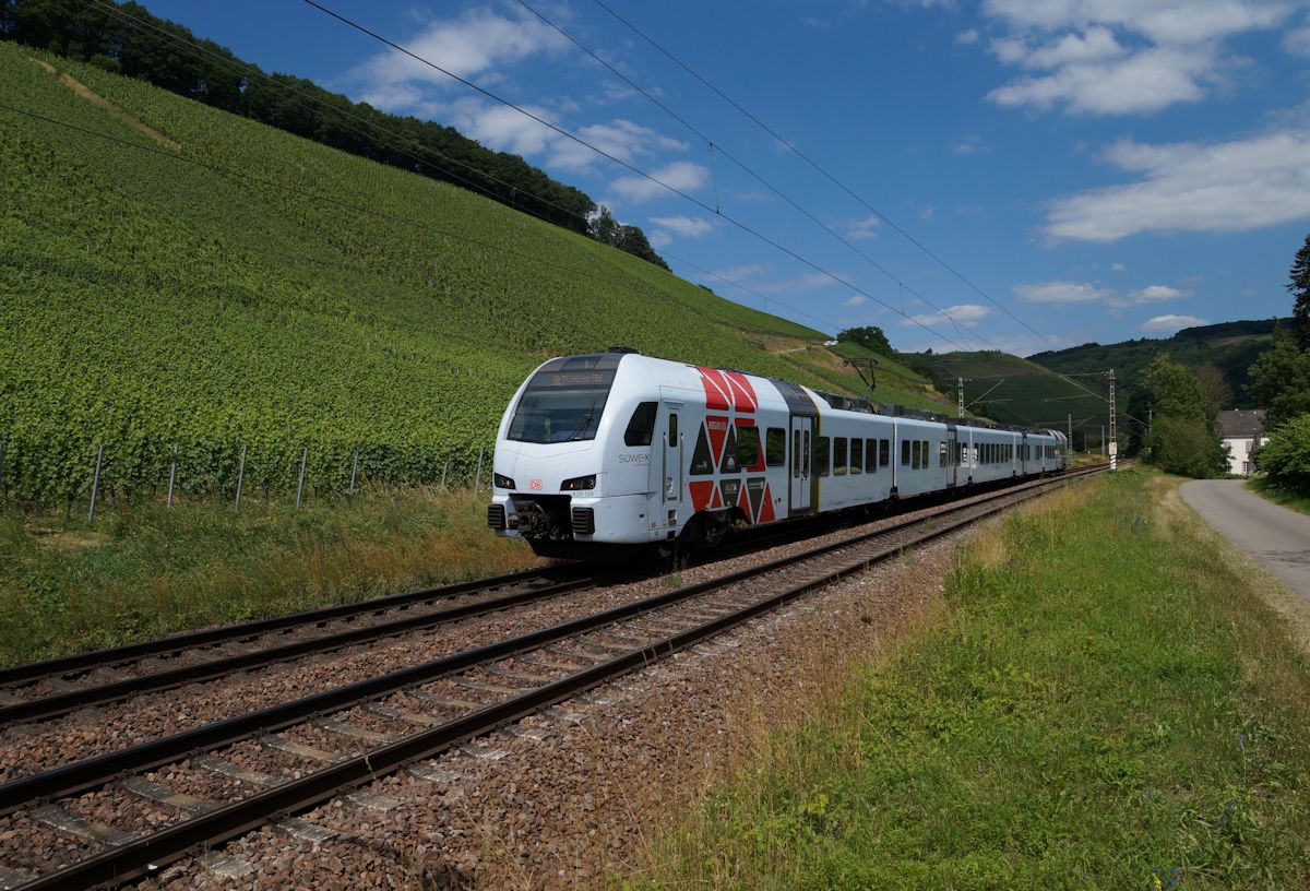 Am 29.6.2018 war 429 108 als RE 4123 auf dem Weg von Mannheim über Saarbrücken und Trier nach Koblenz. Entlang der Saar führt die Strecke vor Konz durch Weinberge, wie hier bei Kanzem.