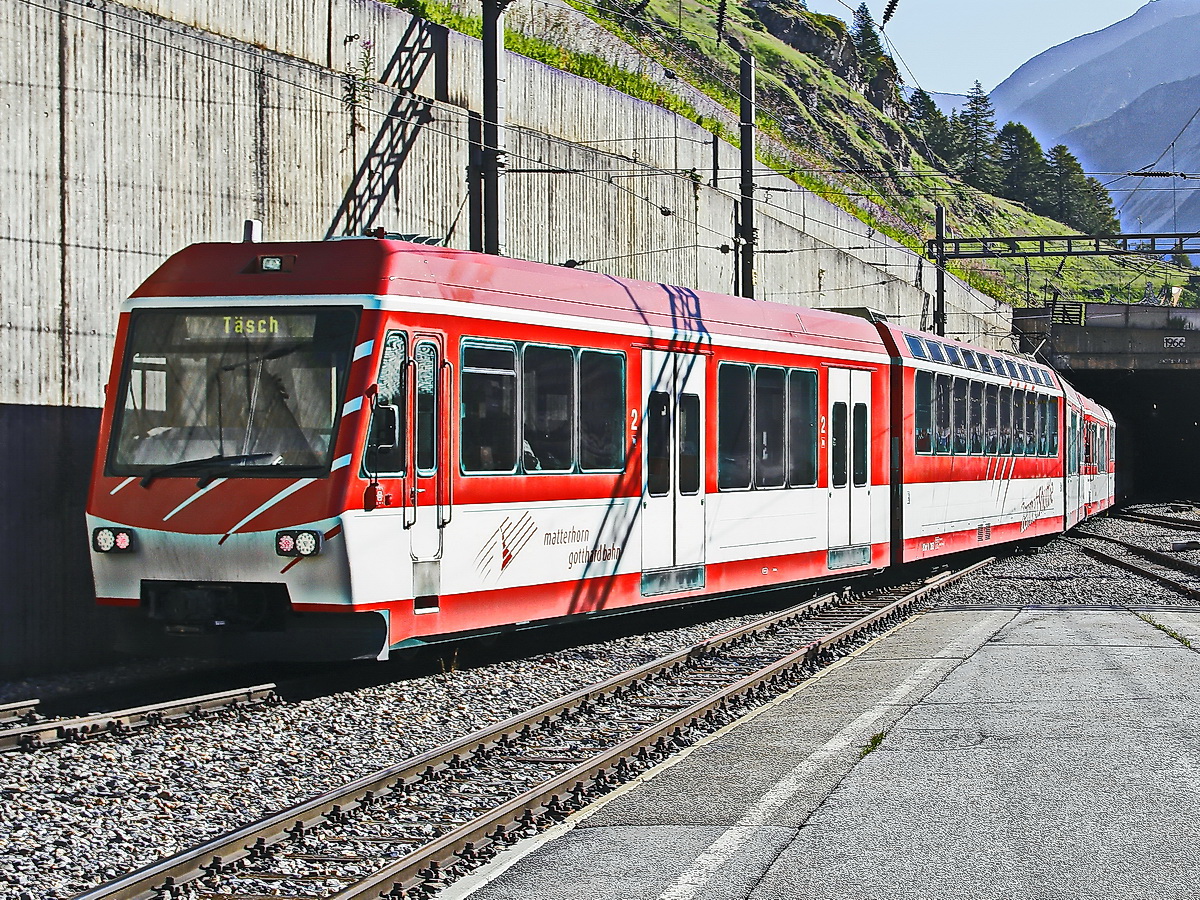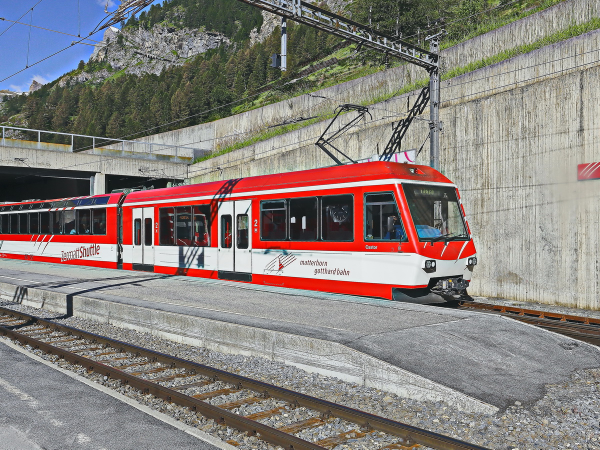Nachschuss auf die Matterhorn Gotthard Bahn nach Täsch am 28. Juni 2018 aus den Bahnhof Zermatt.