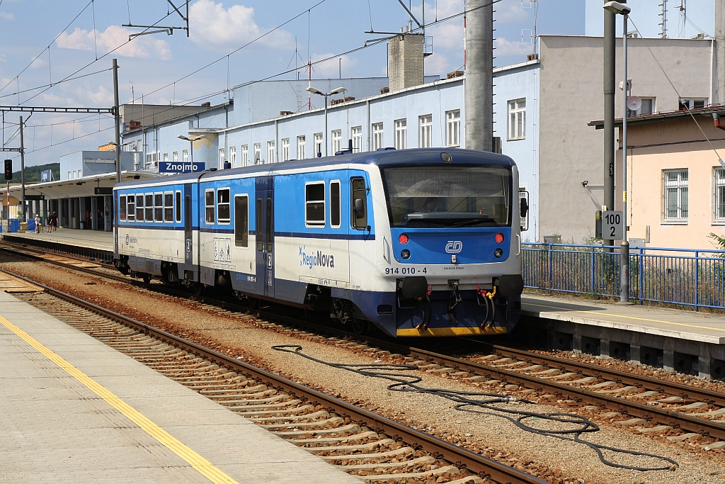 CD 814 010-5/914 010-4 fährt als Os 24807 (Okrisky - Znojmo) am 14.Juli 2018 im Bahnhof Znojmo ein.