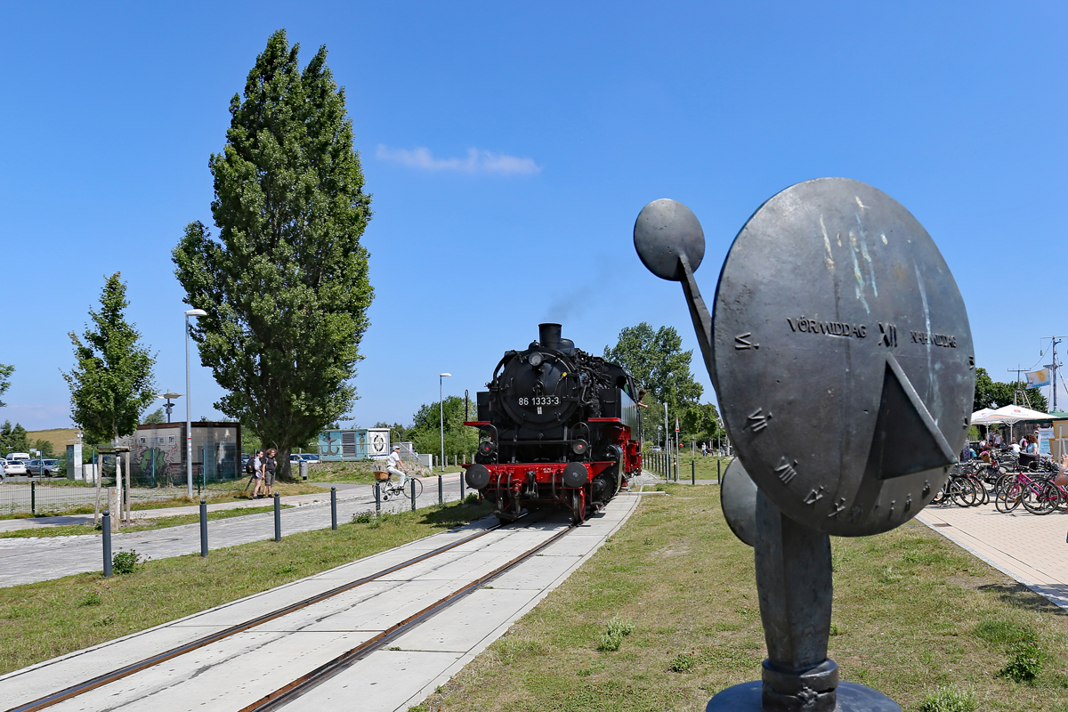 Dampflok 86 1333 als Schlusslok am Sonderzug von Greifswald Hbf nach Greifswald Ladebow ausfahrend im Museumshafen Greifswald. - 15.07.2018