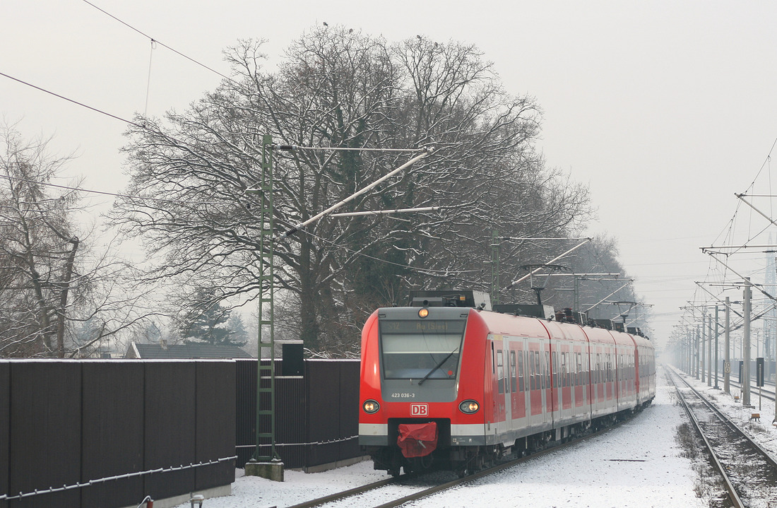 DB Regio 423 036 + 423 ??? fahren in den Haltepunkt Lövenich ein, der sich in Köln befindet. Aufnahmedatum: 27. Januar 2010