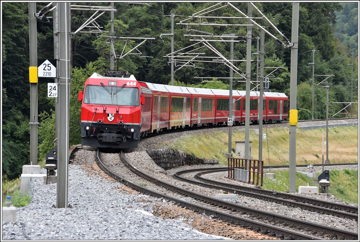 Der IR1136 mit der Ge 4/4 III 644  Savognin  nähert sich der Verzweigung am Ende der Hinterrheinbrücke bei Reichenau-Tamins. An dieser Stelle kommt die Weiche zur neuen Brücke zu liegen. (21.07.2018)