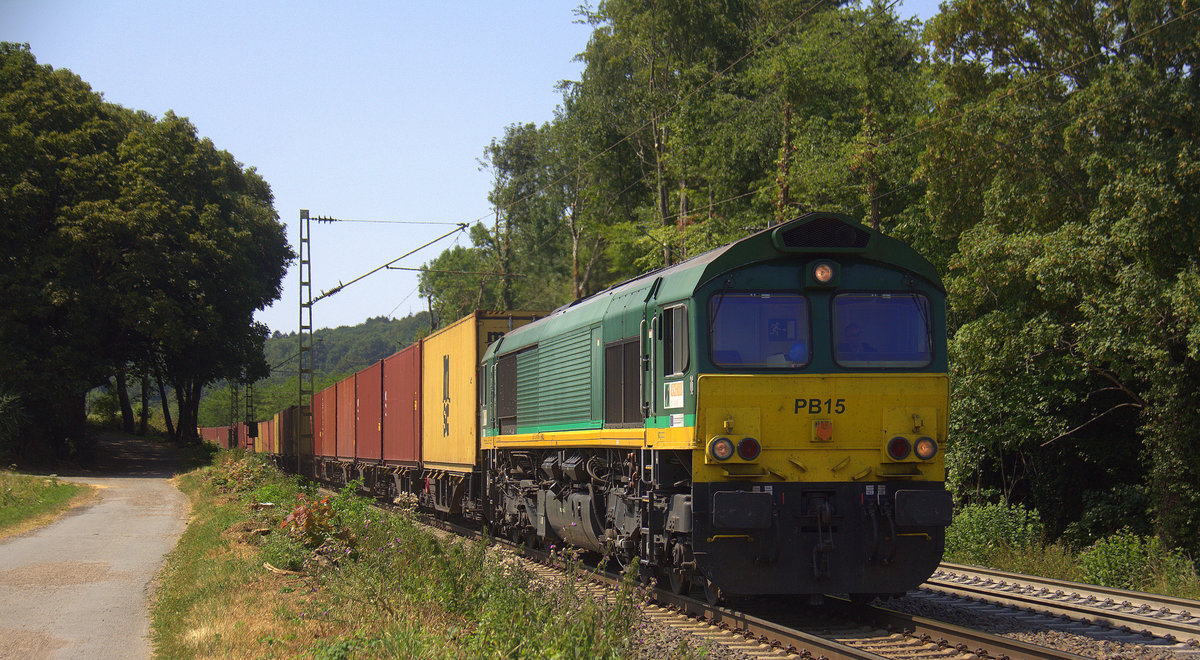 Die Class 66 PB15 von Crossrail kommt die Gemmenicher-Rampe herunter nach Aachen-West mit einem MSC-Containerzug aus Antwerpen-Krommenhoek(B) nach Germersheim(D). Aufgenommen an der Montzenroute am Gemmenicher-Weg. Bei Sommerwetter am Mittag vom 21.7.2018.