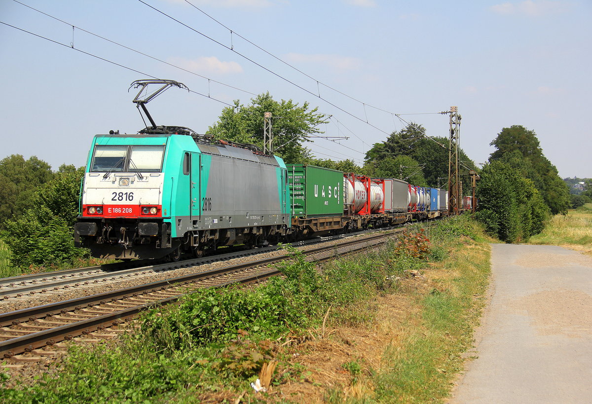 Die Cobra 2816 kommt aus Richtung Aachen-West und fährt die Gemmenicher-Rampe hochgefahren mit einem langen Containerzug aus Gallarate(I) nach Antwerpen-Noord(B) und fährt in Richtung Montzen/Belgien. Aufgenommen an der Montzenroute am Gemmenicher-Weg. Bei Sommerwetter am Nachmittag vom 21.7.2018.