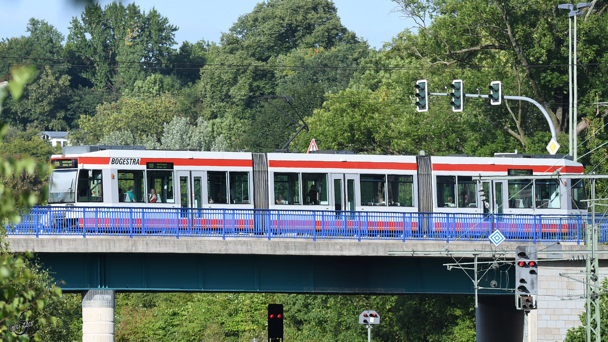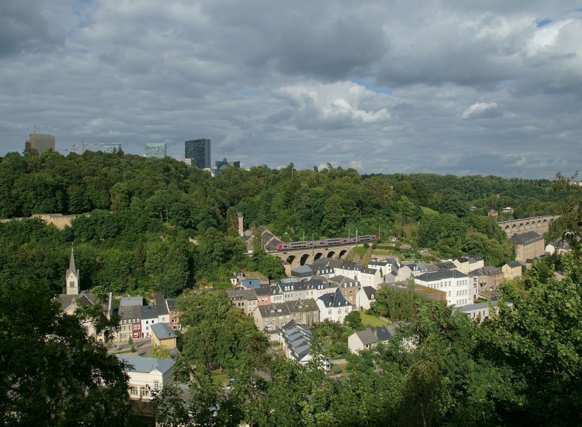 Ein unbekannter CFL-Triebzug der Reihe 2200 war am 22.6.2018 auf dem Weg von Luxembourg Ville nach Troisvierges. Kurz vor dem Haltepunkt Pfaffenthal-Kirchberg wurde dabei der Grünewalder Viadukt über dem historischen Pfaffenthal überquert. Auf dem Kirchbergplateau sind hingegen die modernen Bauten der Europäischen Union zu sehen.