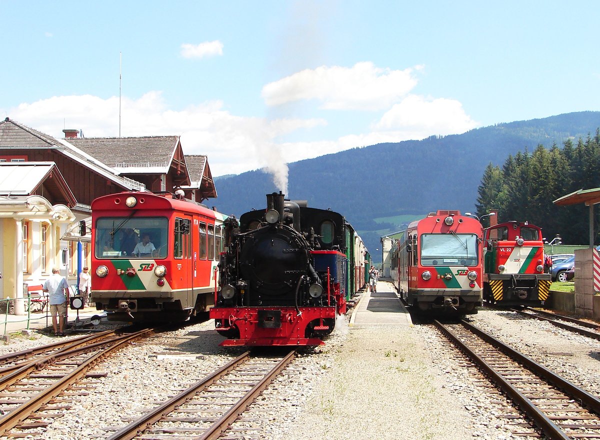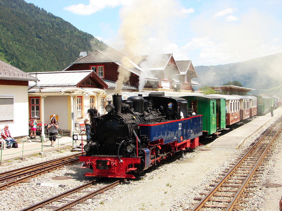 SKGLB 22 bespannte am 19.7.2018 einen Sonderzug von Mauterndorf in der Ferienregion Lungau, nach Murau und wieder retour. Die Aufnahme zeigt den Zug bei der Retourfahrt kurz vor dem Zielbahnhof.