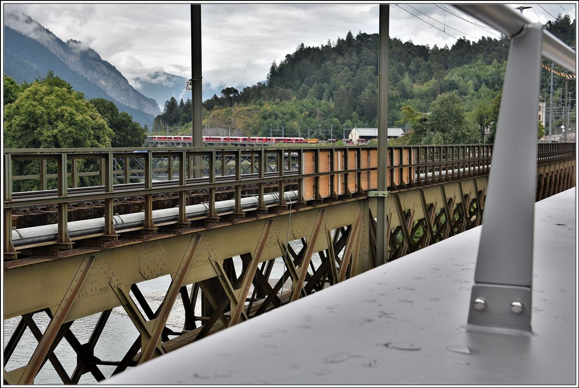 IR1137 mit ABe 8/12 3501 fährt in Reichenau-Tamins ein. Im Vordergrund die jetzige Hinterrheinbrücke der RhB, die nach Inbetriebnahme der neuen Brücke saniert wird. (21.07.2018)
