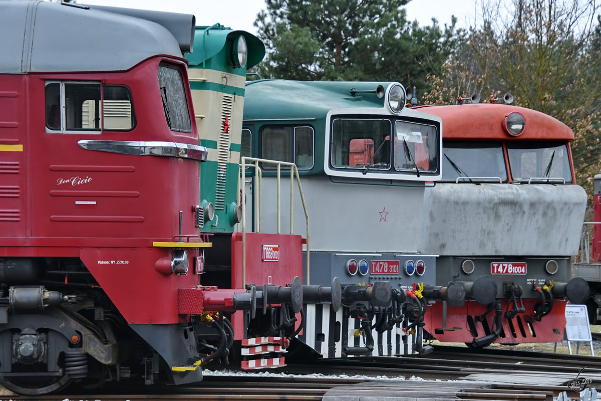 Nasenparade der alten Diesellok´s T678 1600, T669 0001, T478 3103 und T478 1004 im Eisenbahnmuseum Lužná u Rakovníka. (April 2018)