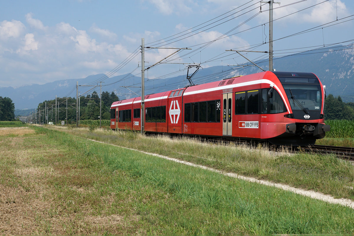 RABe 521 023, auf der S1, fährt zum Bahnhof Muttenz. Die Aufnahme stammt vom 19.05.2018.