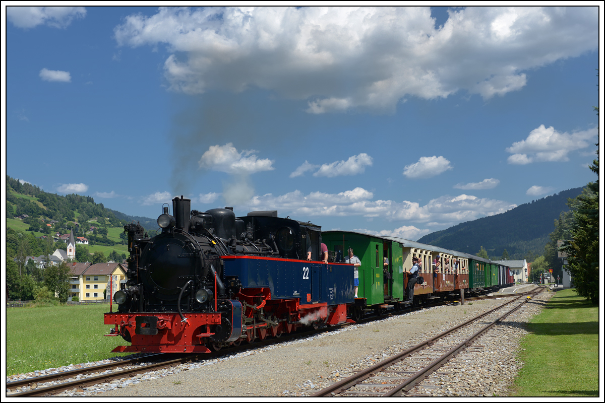SKGLB 22 bespannte am 19.7.2018 einen Sonderzug von Mauterndorf in der Ferienregion Lungau, nach Murau und wieder retour. Die Aufnahme zeigt den Zug bei der Retourfahrt bei der Ausfahrt aus St. Lorenzen.