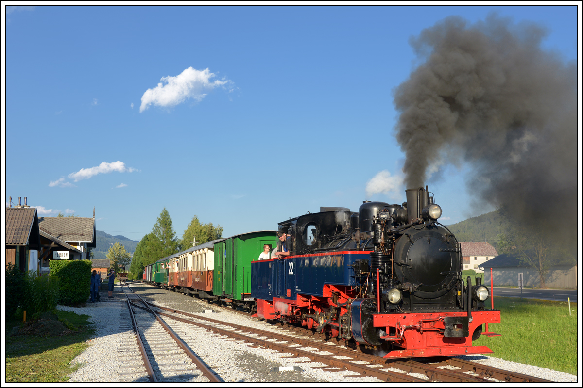SKGLB 22 bespannte am 19.7.2018 einen Sonderzug von Mauterndorf in der Ferienregion Lungau, nach Murau und wieder retour. Die Aufnahme zeigt den Zug bei der Retourfahrt in Maria Pfarr.