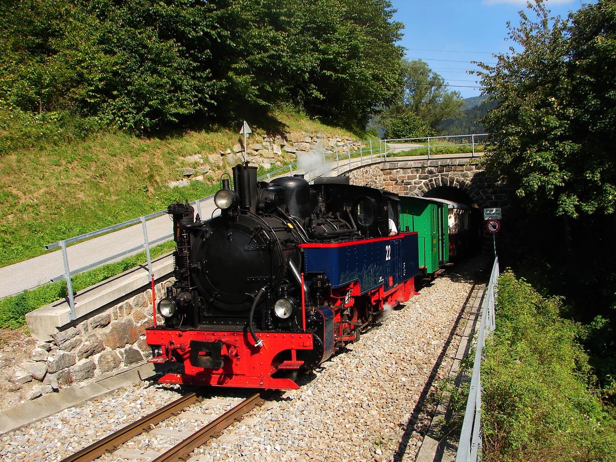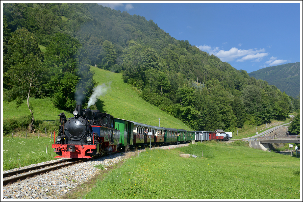 SKGLB 22 bespannte am 19.7.2018 einen Sonderzug von Mauterndorf in der Ferienregion Lungau, nach Murau und wieder retour. Die Aufnahme zeigt den Zug bei der Retourfahrt kurz nach St. Andrä im Lungau.