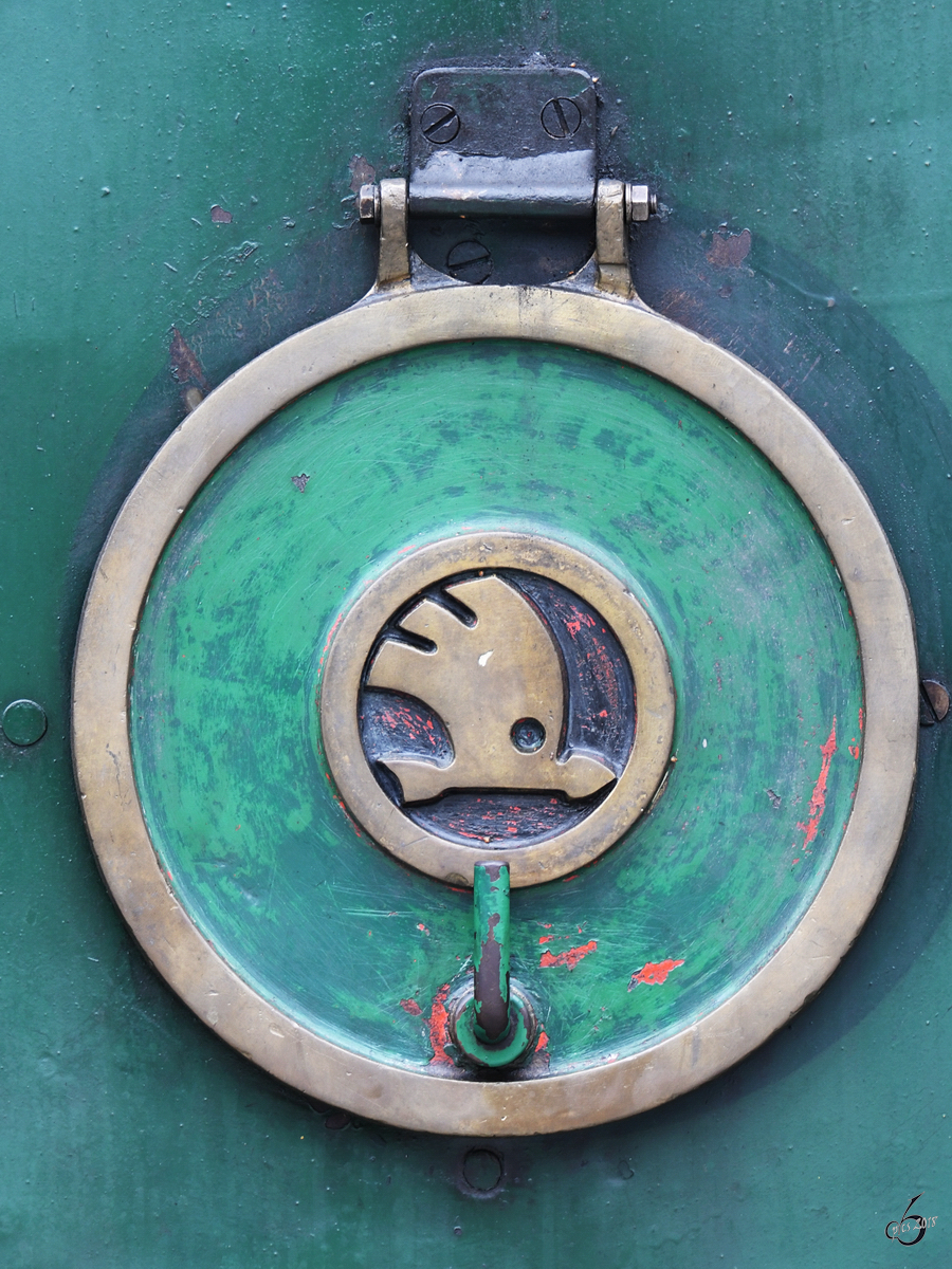 Skoda-Emblem auf dem Deckel des Dampfzylinders der 387 043. (Eisenbahnmuseum Lužná u Rakovníka, April 2018)