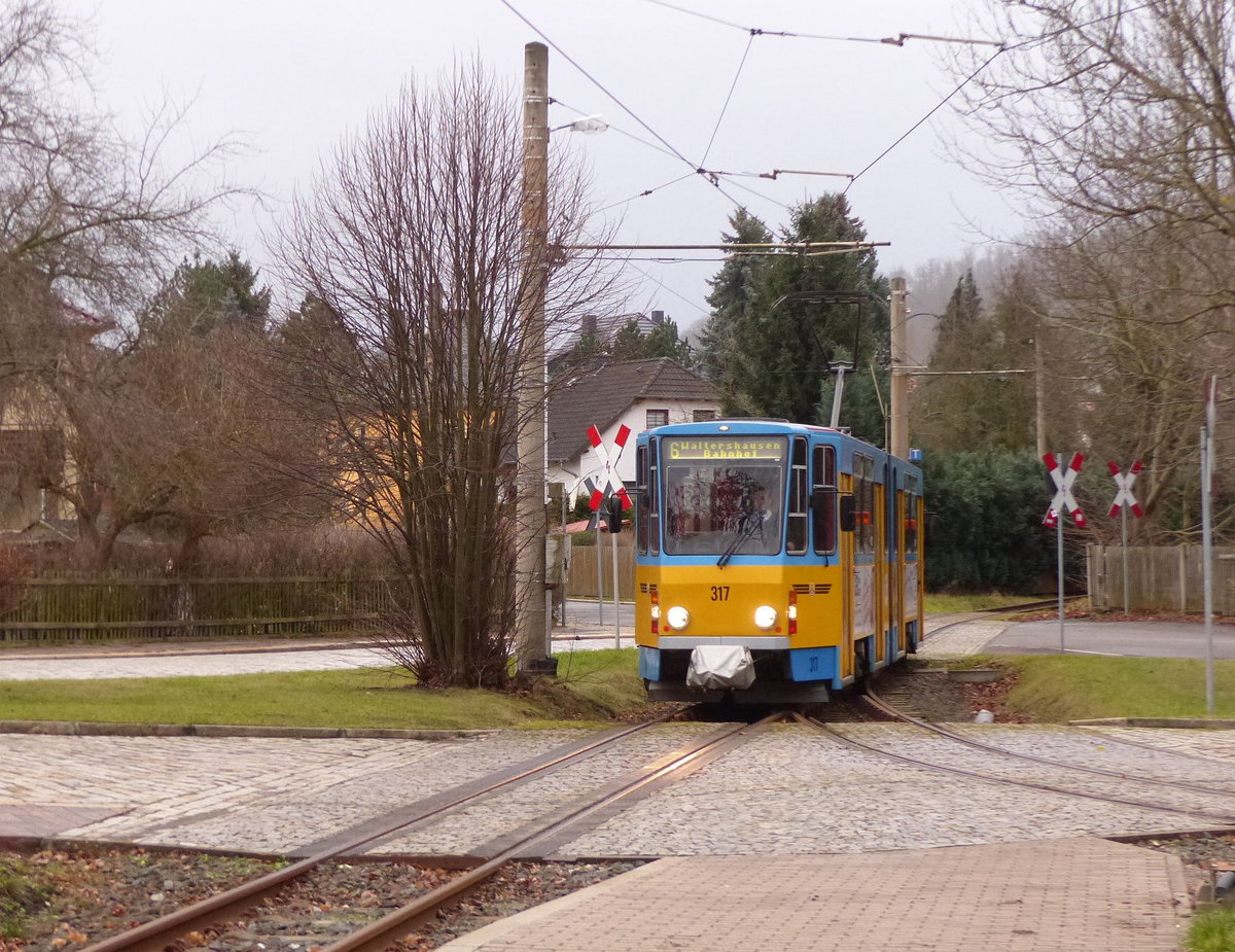 TWSB 317 als Linie 6 vom Gleisdreieck, am 31.12.2017 bei der Einfahrt in die Wendeschleife am Bahnhof Waltershausen.